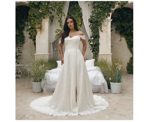 Embrace ultimate romance in this A-line gown, adorned with delicate off-shoulder sleeves and a breathtaking cascade of intricate lace.
