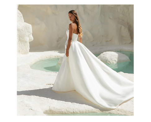 A strapless gown moment, featuring visible boning and drape detailing on the bodice to give a timeless look that feels luxurious.